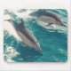 A pair of dolphins quickly moves over the surface of the emerald sea, flying into the air in a spray of foam