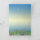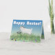 Easter Card for Angora Goat lovers- This handsome Angora is bringing you an Easter basket in his mouth standing in the green grass with colored Easter eggs scattered around the grass. On the inside he left his Easter basket for you in the grass. Happy Easter written in clouds in the blue sky. Goat Easter Cards for anyone who raises or just loves goats.