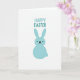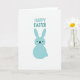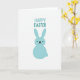 This card features a simple digital illustration of a bunny-like animal silhouette in pastel blue, centered on a bright white background 🐰. The character has long upright ears, a rounded body, and a small hint of a tail at the side, giving it a gentle, approachable shape. Two small dark eyes and a curved smile create the look of a friendly companion, as if it’s quietly sharing a sweet moment with the viewer. Above the figure, the greeting is set in two stacked lines of sans-serif lettering, aligned near the top center. “HAPPY” appears first in a lighter sky-blue tone, with “EASTER” directly below in a deeper teal that stands out more strongly. The wide open space around the bunny keeps the focus on its tender expression and the calm spring palette 🌷. The teal “EASTER” sits just above the tips of the bunny’s ears, while the rest of the page stays uncluttered and white.