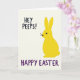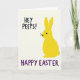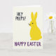 This design shows a stylized bunny figure in bright canary yellow standing on the right side of a soft off-white background 🐰. Its long ears reach upward, and the rounded shape feels gentle and friendly, with one dark circular eye and a few thin black whiskers. The bunny’s slight turn toward the left gives it a shy, companionable look, as if it’s leaning into a shared joke with the reader. In the upper left, the text “HEY PEEPS!” sits in thick, dark lettering, spaced to leave plenty of open air around it. Along the bottom edge, “HAPPY EASTER” stretches wider in deep purple, grounding the layout with a strong base line. The high-contrast colors against the creamy backdrop keep the scene light and springlike 🌷. The overall layout stays simple, with the yellow bunny on the right, the greeting in the top left, and the purple message running across the lower margin.
