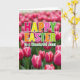 This card features a colorful Easter greeting set over a wide field of spring tulips 🌷. Centered near the top, the words “HAPPY EASTER” appear in large serif letters, each one in a different bright shade like pink, yellow, orange, and green, with a thin white outline that helps them stand out. Just below, “to a Wonderful Aunt” sits in smaller green lettering, placed close enough to feel like a gentle follow-up note. Behind the text, rows of tulips in fuchsia tones open at different stages, and the soft white edging on the petals adds a tender, cared-for look. The mix of sharp lettering and delicate flowers suggests the kind of closeness you’d share with someone who feels like a steady friend as well as family 🐰. In the foreground, a few blooms appear slightly out of focus, while the flower field fades into a pink-and-green blur toward the horizon. The background shows layered tulips receding into a soft, painterly distance with fuchsia petals edged in white.