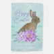 A beautiful Easter bunny sits behind a gorgeous bouquet of purple and teal flowers on a lovely pastel teal watercolor garden flag with elegant personalized lavender script of your family name under Happy Easter. Chic, pretty Happy Easter outdoor decor.