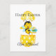 Adorable Easter bee cartoon coming out of a cracked Easter egg, carrying an Easter basket filled with colorful Easter eggs and wrapped with blue bow ribbons