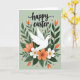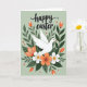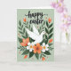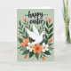 This greeting card features a white bird with wings spread wide at the center, its small orange beak adding a gentle touch against a muted sage green background. Around it, deep emerald leaves curl inward like an affectionate embrace, creating a cozy frame that draws your eye back to the bird. Coral-orange flowers with detailed centers sit among softer white blossoms with golden stamens, giving the scene a friendly, close-knit feel 🌷. Tiny crimson dots and berry-like accents are scattered throughout, like little signals passed between friends across the garden. Near the top, the words “happy easter” appear in black, flowing lettering, spaced clearly above the bird so the greeting feels light and open 🐇. The shapes are layered so the leaves and petals look slightly raised, adding depth without feeling busy. The overall palette stays calm and springlike, with warm accents that suggest a tender, welcoming mood. At the top center, “happy easter” sits in black flowing lettering above the white bird, surrounded by emerald leaves and coral blooms.