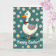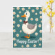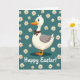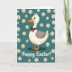 This design shows a white, human-like bird that looks like a goose, with soft gray wings, an orange beak, and orange webbed feet, standing upright with an open, friendly gaze. A small brown bow is tied neatly at its neck, giving it a dressed-up look that feels like it’s ready to greet someone special. Behind the bird is a deep teal background sprinkled with white, daisy-shaped flowers with sunny yellow centers, like confetti scattered across a spring day 🌷. The flowers vary in size and spacing, creating a gentle rhythm that frames the character and adds a hint of flirty charm, as if the bird is posing for a cheerful holiday photo. The lighting looks soft and even, making the whites and teals stand out while the orange and yellow accents add warmth 🐰. Along the bottom edge, the words “Happy Easter!” appear in a casual, flowing letter style in white, standing out clearly against the teal. The bird is centered, with blossoms floating around it and the greeting anchored low, while the brown bow sits just under its beak as a tidy focal point.