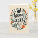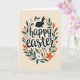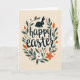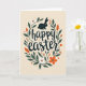 This greeting card features the words “happy easter” centered in a flowing dark ink style, with the letters slightly raised against a warm cream background. An oval wreath of foliage wraps around the text, drawing your eye inward like a gentle hug between friends. Resting above the lettering is a long-eared rabbit silhouette in a deep near-black tone, its small eye angled toward the message as if keeping watch 🐇. The wreath is built from deep teal-green leaves, dotted with crisp white flowers that have dark centers for contrast. Coral-orange blooms and soft peach buds tuck between the leaves, adding a romantic, springtime softness 🌷. Tiny golden-brown dots and small crimson berries are sprinkled throughout, giving the border a lively, textured rhythm. The rabbit sits at the top of the oval, while the dark “happy easter” text remains centered inside the wreath.