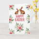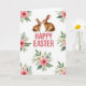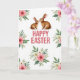 This design shows two soft brown hares near the top, facing each other closely as their dark eyes meet in a gentle, affectionate pause 🐇. The larger hare sits on the right, while the smaller one on the left leans in with a fluffy white tail showing, giving the scene a sweet, friendly closeness. Below them, the words “HAPPY EASTER” sit centered in bubblegum-pink letters that stand out against the pale background. The text is placed just under the hares, leaving comfortable white space so the animals remain the main focus. Around the edges and corners, clusters of spring flowers in blush pink, creamy white, and pale yellow mingle with green leaves and thin branches 🌷. These botanical accents frame the middle without crowding it, guiding your eye back to the hares and the message. Everything rests on a bright white background with soft, even lighting. The top corners show the densest floral sprays, with small petals and leaves curling inward toward the pink lettering.