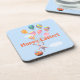Beverage coasters with my artwork of a cute little rabbit holding onto a bunch of striped balloons floating up into the sky while carrying a basketful of Easter eggs. Customizable text says "Happy Easter!"