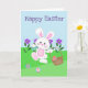This adorable Easter Bunny is collecting colorful Easter eggs to put in his brown, wicker basket. The background features a blue sky and green lawn, with delicate purple flowers. Inside, the left panel has a small image of the Easter Bunny and his basket. The right panel has a text box that you can customize with your own message.