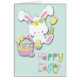 This a cute Easter Season greeting card that features a little white bunny wearing a spring flower head band. An easter basket of pattern Easter eggs sits in front of him, as well as a yellow chick popping out of an egg shell. Behind the bunny rabbit is a yellow tulip. The colorful text says Happy Easter. The images and text are placed on a light pastel green background. The inside of the card has two additional text fields for you to customize. *Thanks to Prettygrafik Design for some of the images used in this design.