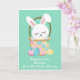 Customize this cute Happy Easter Bunny card with your own personalized text with your kids name in white script. This adorable bunny rabbit sits in a pretty Easter basket on a lovely pastel green card.