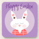 A cute white bunny, with a heart nose and hearts on the ears, is wearing a red checkered shirt. Greeting: Happy Easter framed in lavender and purple.
