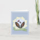 This Happy Easter holiday card features a pretty floral daisies happy easter wreath with grey bunny ears and butterflies on a blue background.