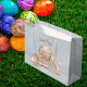 Beautifully stylish Gift Bag with elegant pale blue/grey faux glitter background that enhances subtle bronze graphic Easter eggs and bunny. Decorative font typography greeting "Happy Easter" can be easily customized with your own text. A stunning bag that will delight friends and loved ones as you present them with your gifts over the Easter holidays.