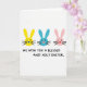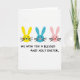 Designed with three rounded bunny faces lined up across the top of a bright white background, this card keeps the scene simple and sweet 🐰. The bunnies are colored sunny yellow, soft cyan, and light pink, and their close spacing gives them a cozy, friendly togetherness like they’ve leaned in for a shared photo. Each has small black dot eyes, fine black whiskers, and a tiny triangle nose in contrasting shades that adds a gentle, affectionate expression. Tall upright ears rise above each head, creating a neat row of repeating shapes that feels calm and balanced. Centered beneath the trio, the message “WE WISH YOU A BLESSED AND HOLY EASTER” appears in black, set in an easy, hand-drawn look that stands out clearly against the white space 🌷. The text sits in the lower half with generous breathing room around it, letting the bunnies remain the main focus while the words read quickly at a glance. The overall layout uses strong color areas against white for a crisp contrast, with the three faces forming a horizontal band above the single line of lettering. The noses show as small triangles in blue, pink, and red beneath the dot eyes, with thin whisker lines extending outward on each side.