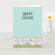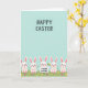 This design shows five fluffy, bunny-like characters lined up along the bottom edge, their round faces blushing with rosy cheeks and their ears tipped with soft pink, as if they’re leaning close like good friends 🐰. They sit on a strip of grassy green ground sprinkled with simple little flowers in yellow, pink, and white, like a small meadow in bloom 🌷. Above them stretches a wide, calm sky in pale blue-green that leaves plenty of open space and keeps the scene airy. Centered in the upper area, the words “HAPPY EASTER” appear in dark gray, all-cap letters with a straightforward, sans-serif look. Near the middle of the group, one bunny holds a small white sign close to its chest, suggesting a sweet, caring gesture toward the others. The sign reads “THINK SPRING” in neat, dark lettering, standing out clearly against the white background. Two tiny, striped, winged insects hover nearby, adding a gentle sense of motion around the group. The flowers dot the green strip in small clusters beneath the bunnies’ feet, with the insects floating just above their ears.
