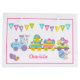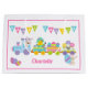 A Cute Happy Easter Holiday gift gag with an Bunny Rabbit driving a train carrying Easter eggs, a chick and a lamb. A lovely sweet design for an Easter holiday gift bag to hold thosel Easter eggs for a special little girl Personalize it by adding the child's name.