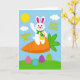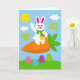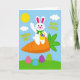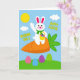 This card shows a stylized white bunny with pink accents on its ears and cheeks, giving a gentle wave that feels like a friendly hello 🐰. With the other arm, the bunny holds a small yellow basket filled with colorful egg-shaped treats, adding a sweet, sharing-between-friends touch. The bunny sits on a large orange carrot with leafy green tops, like it claimed a cozy perch in a spring garden. Behind it is a light blue sky with a round yellow sun and a few soft white clouds drifting by 🌷. Across the upper sky, the greeting “WISHING YOU A HAPPY EASTER” appears in bright yellow text, centered and easy to spot. Along the bottom, rolling green hills stretch across the scene, keeping everything grounded and calm. Scattered on the grass are oversized egg shapes in pink, blue, purple, and lime green, each with smooth, simple color areas and crisp outlines. The carrot’s green leaves fan upward in three pointed shapes above the bunny’s head.