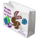 Happy Easter to You From Easter Bunny holiday gift bags. Hippity-Hop is written on the back with cute yellow chick hatched from its striped pink and green egg with the look of gold glitter on its head and wings and colorful sprinkles on its belly, with pretty decorated eggs on front and back of bag. Keep wording as is or personalize the text fields. Original Artwork © 2013-2016 TamiraZDesigns.