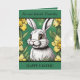 Editable Easter card featuring an Easter Bunny and daffodils. Editable text.