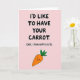 Designed with a soft pastel pink background, this Easter-themed card sets a gentle, flirty tone like a friendly wink between close pals. Across the upper area, large black hand-drawn lettering reads “I’D LIKE TO HAVE YOUR CARROT,” giving the message a cheeky start 🐰. Just beneath it, a smaller line in the same black lettering says, “SORRY, I MEAN HAPPY EASTER,” turning the moment into a bashful save that feels oddly sweet. The contrast in text size makes the first line feel like a bold blurt, while the second reads like a quieter, affectionate correction. Down toward the lower right, a bright orange carrot sits as the main illustration, outlined in black with a simple smiling face that makes it feel like it’s in on the joke 🐇. Thin horizontal lines run across the carrot for texture, and a small tuft of green leaves sprouts from the top. The carrot’s face is made of two dot eyes and a curved smile, with the orange body standing out against the pink field.