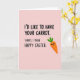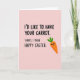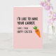 This greeting card features a blush pink background with a cheeky two-part message in casual black lettering, arranged mostly on the left side. The top line reads “I’D LIKE TO HAVE YOUR CARROT,” set larger and higher, like it’s confidently leaning in with a flirty grin. Just beneath it, in smaller black text, “SORRY, I MEAN HAPPY EASTER” softens the joke, like a friend laughing and nudging your shoulder. The open space around the words keeps the layout airy, letting the humor land without feeling crowded. In the lower right, an orange carrot character with leafy green top adds a sweet touch of romance through its bright eyes, rosy cheeks, and wide smile, as if it’s looking back at the message with a bashful, pleased expression 🐰. Simple shading and a few texture lines give the carrot a lightly sketched look while staying smooth and easy to read. The carrot sits angled slightly upward in the bottom-right corner, with its green leaves fanning out against the pink background 🌷.