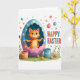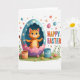 This card shows a spring scene on a white background with a striped cat peeking out from a large cracked egg, one paw lifted as if waving hello 🐰. The cat’s wide eyes and small smile lean toward friendly affection, like it’s greeting someone it’s glad to see. The big egg sits near the center, colored in pale blues and pinks with dotted decorations and soft shading around the opening. To the right, the words “HAPPY EASTER” appear in rounded, multicolored letters, stacked neatly so they balance the central illustration. Along the bottom, smaller patterned eggs rest in short green grass with tiny flowers 🌷. Nearby, two small paint pots labeled “EASTER” add a cozy, shared-craft feel, as if the scene was set up for decorating together. A paintbrush leans against the large egg beside the scattered eggs and floral details.