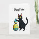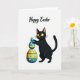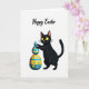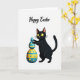 This card shows a stylized black cat with smooth dark fur leaning toward a tall stack of three decorated eggs, as if sharing a secret with them 🐰. The background is plain white, making the cat’s bright yellow eyes and small smile stand out with a friendly, slightly teasing look. One paw rests gently on the smallest egg at the top, suggesting careful balance and a soft, affectionate patience rather than mischief. Above the scene, the words “Happy Easter” sit centered near the top in flowing black lettering. The three eggs form a neat vertical column beside the cat, creating a close, companionable arrangement like two friends huddled together. Each egg is patterned with stripes and dots in blue and yellow, adding lively contrast against the cat’s dark shape 🌷. Fine texture and crisp outlines give the illustration a lightly tactile look, especially around the cat’s face and paws. The bottom egg shows wide blue and yellow horizontal bands with scattered polka dots, while the upper eggs repeat the same colors in smaller stripes and spots.