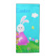 A cute pink bunny holding an Easter basket filled with colorful Easter eggs, a chick just hatched, and a message of “Happy Easter.”