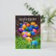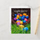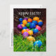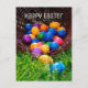 Wish your friends and family a "Happy Easter" with a striking postcard featuring a photo of colorful blue, yellow-orange, purple, green, and pink Easter eggs spilling out of a dark brown Easter basket onto green grass.
