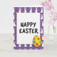 This card features a bright purple background wrapped around a crisp white rectangular panel at the center, where “HAPPY EASTER” appears in black letters across the middle. Around the edges, small white long-eared bunnies 🐰 are shown in different poses, including a few that lift a paw as if waving to someone they adore. Tiny egg shapes and little orange carrot-like roots are sprinkled between them, adding pops of color that feel like friendly little surprises. The flat, graphic look of the background makes the main accent stand out: a shiny yellow egg shape placed at the bottom right. Its glossy surface catches highlights like a polished decoration set out for someone special, and the nearby bunnies seem to “gather” around it with an affectionate, welcoming energy. The text stays neatly contained on the white panel, leaving plenty of purple space for the repeating bunny pattern and scattered spring icons 🌷. The yellow egg is dotted with large round spots in red and blue, with light reflections curving across its smooth surface.