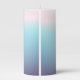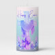 This is a pillar candle with gradient pink to aqua to muted purple background. It has "Happy Easter" across the top of the artwork. The art is an Easter cross draped with cloth, and flowers surrounding it. May be personalized and fonts and images can be changed as well.