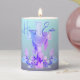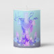 This is a pillar candle with gradient aqua to muted purple background. It has "Happy Easter" across the top of the artwork. The art is an Easter cross draped with cloth, and flowers surrounding it. May be personalized and fonts and images can be changed as well.