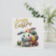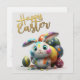 This Easter card is decorated with a cute bunny painter, with big ears, big eyes and a little pink nose, coming out of an egg, in an animation movie style. He is surrounded by a few small colored eggs in different shades of pink, blue, green and yellow. The happy and festive message "Happy Easter" is written in gold letters.