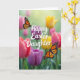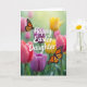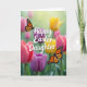 Designed with a spring garden scene, this card shows a field of tulips painted in fuchsia, amethyst, crimson, and warm golden tones, with soft green haze behind them 🌷. Two winged insects hover near the center, their orange-and-black mosaic wings edged with tiny white accents, as if they’ve paused together in midair like close companions. A pale, sunlit glow spreads across the upper background, giving the flowers a gentle shine and making the moment feel quietly affectionate. The message “Happy Easter Daughter” sits centered over the blooms in flowing, dark lettering that stands out against the lighter petals. The words are large enough to read at a glance, with the tallest letters reaching slightly into the brighter area near the top. Around the text, the tulips blur softly while the insects stay crisp, creating a tender contrast that draws your eye back and forth. Small touches of gold and pink peek between stems, and the insects’ wings angle toward each other above the layered tulip heads 🐰.