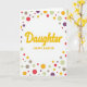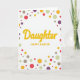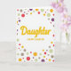 This card features a bright white background with the word “Daughter” centered in golden-yellow, drawn in flowing, curving letters that feel like a warm hug. Just beneath it, “HAPPY EASTER” sits in a smaller, simple all-caps style in the same golden tone, keeping the message neatly stacked in the middle. Both lines have a slight raised look that catches the eye without feeling heavy. Around the text, scattered circles in different sizes form a loose frame, like confetti drifting in from the edges. The dots mix reds, oranges, soft greens, muted browns, and deep purples, creating a springtime palette that feels friendly and affectionate 🌷. Their uneven spacing adds motion, as if the colors are swirling around the center the way loved ones gather close for a holiday moment 🐰. The circles are sprinkled more densely near the corners and thin out toward the center, leaving the words clearly visible.
