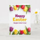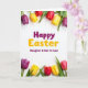 Designed with a bright white background, this Easter card centers a seasonal greeting that speaks to family closeness and a caring bond 🐰. The main line reads “Happy Easter Daughter & Son-In-Law,” placed prominently in the middle so it’s the first thing you notice. “Happy” and the family dedication appear in deep purple, while “Easter” stands out in goldenrod yellow for a sunny contrast. Above and below the text, cup-shaped spring flowers decorate the margins, as if they’re gently leaning in to frame the message like supportive friends 🌷. The blossoms show fuchsia, warm yellow, and crimson petals, adding lively color without crowding the center. Slender green stems and fresh leaves weave between the blooms, giving the design a light, garden-like setting. The flowers at the top edge tilt slightly in different directions, and a matching row along the bottom balances the layout with the same colors and greenery.