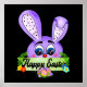 This poster features a cute, cartoon purple bunny with big, sparkling blue eyes peeking over a green banner. The banner reads "Happy Easter" in a friendly script, framed by green leaves and colorful flowers. Below the banner rests a cluster of brightly decorated Easter eggs in purple, pink, and yellow, all against a striking black background that makes the colors pop.