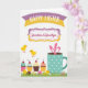 This design shows a cheerful early-spring scene on a white background, with festive banners stretching across the top like party flags 🌷. A scalloped banner in purple and yellow carries the words “HAPPY EASTER” in large, easy-to-read letters centered near the top. Just below it, a dotted decorative frame holds the words “Grandma & Grandpa” in a flowing, cursive-style line, giving the greeting a tender, close-to-home feel. The lower half turns into a grassy strip in rich green, where pastel oval eggs peek up as if tucked into the lawn. Small yellow birds are scattered around the scene, their tiny shapes and nearby spacing suggesting friendly little pairs. On the right sits an oversized teal mug with white polka dots, and two pink bunny-ear shapes rise from it like a cozy surprise 🐰. In the middle ground, four cupcakes line up with swirled frosting, colorful sprinkles, and shiny red cherries, with the teal mug towering beside them.