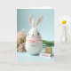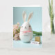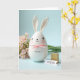This card features an egg-shaped character with long rabbit ears 🐰, set slightly right of center on a soft pastel blue background that feels calm and gentle. Its pearly white surface catches the light, and the tiny black eyes, small nose, and rosy cheeks give it a sweet, friendly look, like it’s quietly leaning in to greet someone. A slim pink ribbon wraps around its middle in a tidy bow, adding a soft touch that reads like a little gift. The word “HAPPY” sits above the ribbon in small, subtle lettering, blending neatly into the character’s bright surface. On the left, a hazy cluster of light pink blossoms with hints of green suggests springtime and adds a tender, romantic softness 🌷. Near the right side, a small white banner shows “EASTER” in black letters, placed close to a short rectangle of golden glitter that adds sparkle. The banner sits just before the glitter accent, with the blue backdrop staying open and airy behind the bunny-eared figure.