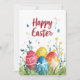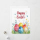 Happy Easter with this festive holiday greetings in a soft cream pastel watercolor look with vibrant easter eggs and floral elements. Time for the easter egg hunt with flowers in an elegant calligraphy. Green Grass at the bottom.