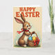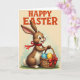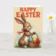 This design shows an upright cartoon-style rabbit 🐰 with a brown coat, bright white belly, and fluffy tail, standing on a patch of green grass and facing the viewer with an inviting, friendly look. A red ribbon is tied around its neck, and the matching bow on a woven basket hints at a sweet, thoughtful connection, like a small gift meant for someone close. The rabbit’s wide eyes shine, its pink nose sits above an open smile with two front teeth showing, and its paws curl gently around the basket handle as if offering it forward. Inside the basket are decorated eggs with polka dots in bright blue, sunny yellow, and deep pink, adding a cheerful spring touch 🌷. The background is pale cream with a soft fade into muted green near the bottom, keeping the focus on the rabbit and its basket. Across the top, the text “HAPPY EASTER” appears in textured red letters, centered and easy to read against the light backdrop. The red lettering sits above the rabbit’s ears, while the basket rests near the lower center on the grassy patch with the bow angled slightly to the right.
