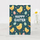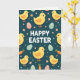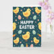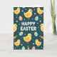 This card features a deep teal background with large white capital letters reading “HAPPY EASTER” centered near the top, giving the layout a clear focal point. Scattered across the scene are many fluffy yellow chicks with tiny black dot eyes and small orange beaks, spaced in a way that feels like they’re gathering together as friendly little companions. Their rounded bodies include light orange shading on the wings and small webbed feet, adding a soft, affectionate look to each one. Between the chicks sit decorated eggs in gentle pastel pinks and blues, covered with stripes, dots, and loose abstract marks that add variety without crowding the space. Small blossoms in pink and white float around like little nods of spring 🌷, mixed with confetti-like dots for extra sparkle. A few orange carrots with green tops are tucked in among the eggs and chicks, giving the scene a cozy garden feel that suggests shared treats and close company 🐰. The text stays crisp and bright in white against the dark background, while the surrounding elements keep to warm yellows, soft pastels, and touches of orange and green. Tiny pink flowers and scattered multicolored dots fill the gaps around the chicks and eggs.