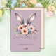Featuring a watercolor bunny design and purple background adorned with delicate pastel floral accents, this card radiates warmth and joy. Perfect for sending Easter greetings and Easter blessings to loved ones, the design captures the playful spirit of cute bunnies and the renewal of spring. Personalize it with your family name for a unique and thoughtful holiday touch. Send joy this season—order your Easter holiday cards today!