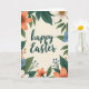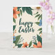 Designed with a tall, springtime layout, this card centers the words “happy easter” in dark green lettering on a warm cream background 🌷. The text sits right in the middle, leaving airy space around it like a quiet pause between friends. Encircling the message is a leafy border that curls and overlaps, as if the stems are gently leaning toward one another in a close embrace 🐰. Large flowers bloom along the edges in soft coral, white, and calm blue, their petals layered and slightly rounded. Deep green leaves fill the gaps, with small berry clusters in earthy orange and dusky blue adding dotted texture near the corners. Light falls evenly across the design with no harsh shadows, keeping the palette soft and springlike. Tiny golden stamens sit at the centers of the larger blossoms, catching the eye like small sparks against the petals.