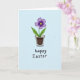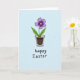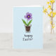 This card shows a spring illustration with a single potted flower centered on a wide, light blue background that feels calm and open. The flower has five scalloped petals that fade from pale lavender at the edges into deeper violet near the middle, like a gentle blush shared between close friends. At the center sits a sunny yellow circle with a few tiny dark marks, drawing your eye like a small, affectionate glance. A slim green stem rises from the pot with two soft green leaves spreading outward, adding a relaxed, welcoming look 🌷. The container is lightly see-through, and you can see textured brown soil inside, grounding the scene in a simple, cozy way. Below the pot, the words “happy Easter” appear in lowercase black lettering, placed neatly near the bottom with plenty of breathing room 🐇. The outlines are clear while the color areas look softly washed, and the pot’s faint edges and the grainy soil specks are visible against the pale blue field.
