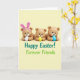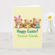 This card shows three cute, bear-like figures lined up across the lower part of a soft pale yellow background, posed close together like friends leaning in for a photo 🐰. The middle figure sits between the other two, and their rounded faces and small smiles create a tender, affectionate mood. Their honey-toned bodies look like smooth little figurines, with soft light catching the curves and leaving faint shadows beneath them. Each one holds an egg-shaped object in its paws—one white, one yellow, and one blue—adding small pops of color that feel like shared treats. The left figure wears a pink headband with tall pointed ears, giving a gentle springtime nod 🐇. Below the trio, a line of green text is centered near the bottom and reads “Happy Easter! Forever Friends,” standing out clearly against the pale background. The green letters sit beneath the characters with comfortable spacing, and the eggs shine lightly with a rounded highlight. The pink ear headband has two upright points and rests neatly on the left figure’s head.