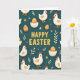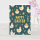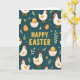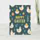 This design shows a deep teal background with a large golden-yellow “HAPPY EASTER” placed prominently near the center, standing out clearly against the darker field. Around the lettering, a repeating pattern of small white birds fills the space, each with red combs, orange beaks and feet, and a touch of golden-yellow on the wings. Their tiny dot eyes and close spacing create a cozy, togetherness that reads like friendly company gathered in a spring scene 🌷. Scattered between the birds are egg shapes, some whole with orange-and-cream zigzags and dots, and others shown cracking open from pale cream shells. Little golden-yellow leaf sprigs and small white-and-orange flowers are tucked into the gaps, softening the geometry and adding gentle, affectionate warmth 🐰. The overall layout feels balanced, with the text anchoring the middle while the pattern wraps around it like a shared celebration. Cream shell fragments and orange patterned eggs appear in several spots, with one cracked egg showing jagged edges against the teal backdrop.