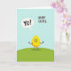 This design shows a sunny yellow, oval-shaped character standing on a gently curved green hill under a pale blue sky, giving the scene lots of open, airy space 🌷. Its wide smile and rosy cheeks pair with thin black arms and legs, with one arm lifted as if waving to a friend passing by. The character’s friendly posture and soft blush suggest a sweet, affectionate hello, like a small moment shared between close pals. Above its head, a white speech bubble holds the short greeting “YO!” in dark lettering, floating slightly left of center. Near the upper right, the words “HAPPY EASTER.” appear in simple black text, spaced clearly against the sky. The shapes are smooth and minimal, with flat areas of color and crisp outlines that keep the focus on the character’s expression. A tiny 🐰 touch comes through in the springtime feel of the hill-and-sky backdrop. The green hill arcs upward from left to right beneath the bright figure.