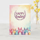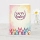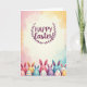 This card features a tall, vertical illustration that celebrates spring with soft, blended pastel washes in rose, golden yellow, sky blue, and lavender. Near the top, the text “Happy Easter!” sits centered in deep plum lettering, standing out clearly against a creamy, lighter area. A neat, symmetrical wreath of stylized leaves surrounds the greeting, adding a gentle, garden-like frame 🌷. Along the lower portion, a row of small, egg-shaped characters with long animal ears forms a friendly border, leaning toward one another like close friends posing for a photo 🐰. They’re colored in pinks, yellows, blues, and purples, each decorated with simple patterns like stripes and dots. Their faces vary from calm, closed-eye smiles to wide grins, and the way their ears tilt and overlap suggests a tender, companionable closeness. The background remains softly painterly, with the pastel colors fading into one another behind the characters and the leaf wreath.